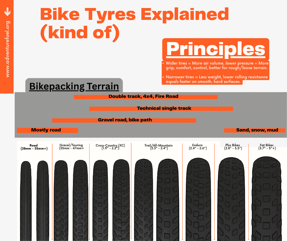 This might be a pretty contraversial post but I am setting out to answer, What tyres are best for bikepacking? I am hoping to convey this with a simple infographic but let me know if this needs some tweaking or clarification.